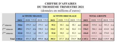 C'est d'ailleurs une progression deux fois plus rapide que celle de l'activité négoce qui est depuis le début de l'année d'un peu plus de 16 % comparé à 2019. Toutefois on change de catégorie puisqu'en 9 mois le business négoce dépasse le milliard d'euros, trois plus que brico, sans une seule baisse depuis le début de l'année, même si le dernier trimestre est plus proche de la stagnation (+0,5 %). Un coup de frein dû aux diverses pénuries ? Non juge le Groupe qui explique ne pas avoir été " impacté de manière significative par les pénuries de matériaux de construction".