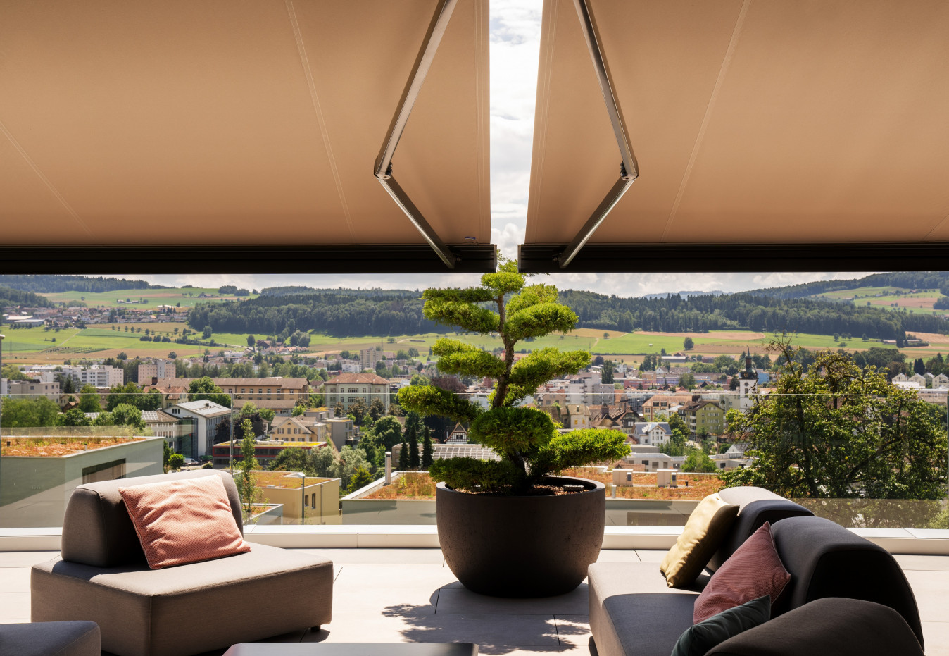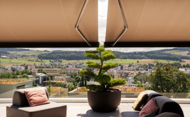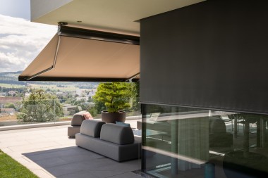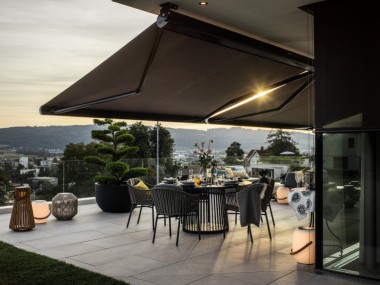 La terrasse agrémentée d’une vue magnifique est équipée de deux stores bannes à coffre KGM 6, de couleur beige, qui permettent de profiter intégralement de la vie en plein air lors de chaudes journées d’été. Montés au plafond pour une inclinaison précise et flexible des bras, ces stores bannes garantissent un ombragement efficace avec une projection de 4 mètres, ainsi qu’une protection optimale contre l’éblouissement et les UV.