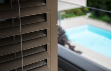À l’étage, des brises soleil orientables, à lamelles reliées, VR 90, associés à une moustiquaire compacte intégrée au linteau, délivrent une luminosité agréable et garantissent des nuits tranquilles. La technique éprouvée des stores à lamelles reliées est facile à manoeuvrer, silencieuse et très prisée.