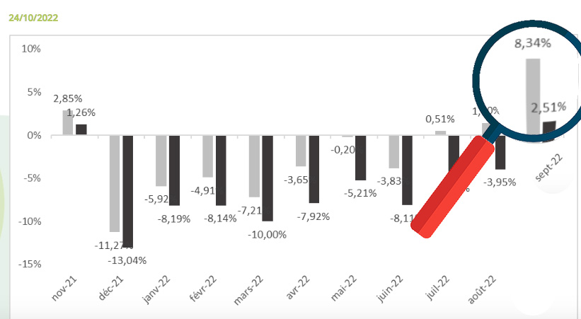 Le marché fait encore mieux que ce que nous avions annoncé dans le numéro 20 de Zepros Habitat. En effet depuis notre bouclage, la FMB a envoyé un rectificatif sur les chiffres de vente en GSB du mois de septembre 2022. Au lieu d'une progression de 4,22 % en valeur et une chute de 1,38 % en volume initialement annoncés , le marché est finalement à + 8,43 % en valeur, et même +2,51 % en volume. Ce n'est pas la même limonade. Cela veut dire que pour la première fois depuis novembre 2021 les ventes en volume sont positives. En glissement annuel, le marché est à - 2,9% en valeur et à près de - 6,5 % en volume. A quoi doit-on ce redressement ? Selon la FMB, « L’augmentation des prix de l’énergie et l’annonce du plan de sobriété énergétique du gouvernement ont naturellement dynamisé le rayon chauffage (granulés de bois, chauffages d’appoint, etc.). Si cette croissance est à relativiser dans le contexte inflationniste, la tendance du secteur reste positive (progression des ventes de 24% par rapport à 2019) ».