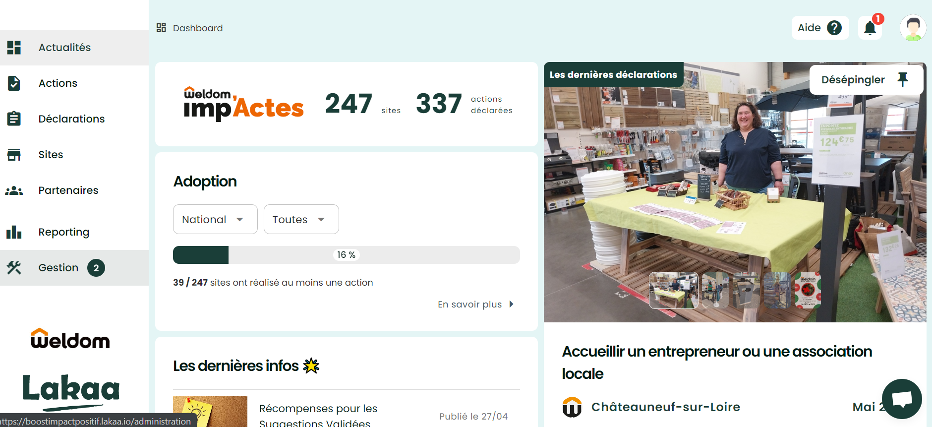 Pour mobiliser les équipes sur ces sujets, il est rapidement apparu nécessaire de s’appuyer sur un outil, qui permette de nourrir ces quatre piliers. «Nous nous sommes ainsi rapprochés de la plateforme Lakaa afin de mettre à disposition des fiches action pour aider les magasins à mettre en oeuvre ces initiatives», confie la responsable RSE. Lakaa se présente comme une solution tout-en-un conçue pour les entreprises multi-sites afin d’animer, piloter et valoriser l’ensemble des actions RSE menées en local.