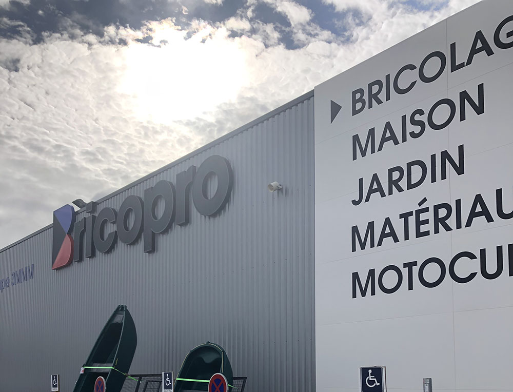 Vue panoramique du magasin Bricopro dernière mouture avec une belle entrée vitrée, au centre : une entrée Cour des Matériaux ... et à droite le négoce de matériaux.