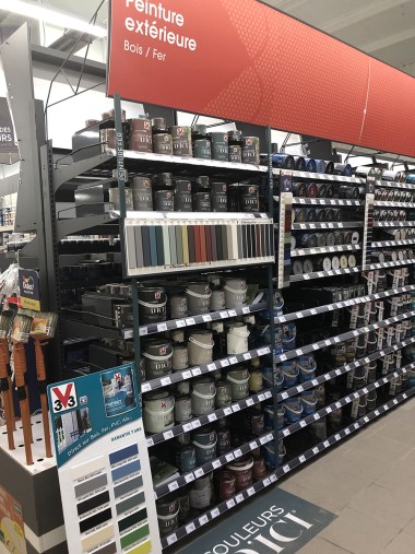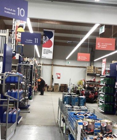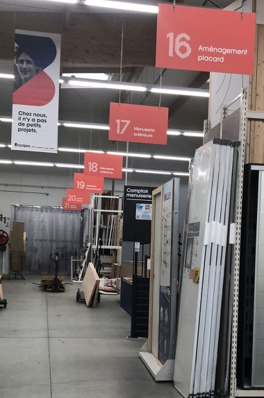 Chaque rayon est très précisemment indiqué. En revanche, pas de grands panneaux de secteurs. On retrouve l'alternance rouge et bleu de la signature d'enseigne qui rythme les univers ou tout simplement, le côté droite ou gauche des allées. Les grands panneaux sont utilisés pour insister sur l'âme de Bricopro sur le thème du "Chez Nous" déclinés en sauce de proximité : "entre voisins on se tutoie facilement", " c'est souvent une affaire de famille", il n'y a pas de petits projets" etc.