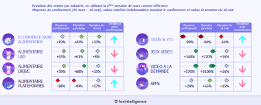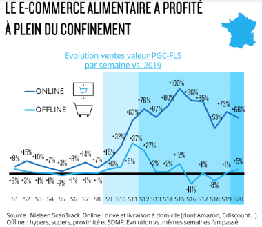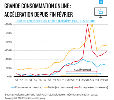 On rappelle que le ecommerce alimentaire et le bricolage sont les deux grands gagnants si l’on peut dire de cette période tragique. Les résultats de l’Italie et de l’Espagne sont incroyables en la matière. Ci-dessous les résultats proposés par Nielsen avec la Fevad…