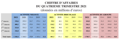 Le groupe Samse a annoncé un chiffre d’affaires consolidé en hausse de +17,1 % en 2021 par rapport à 2020 (+16,6 % à périmètre comparable). Côté brico, L’Entrepôt du Bricolage et ses 38 magasins ont réalisé « une très bonne performance commerciale » sur l’ensemble des deux dernières années Avec un chiffre d’affaires de 401 M€, l’activité Bricolage est en augmentation de 14,3% sur l’exercice 2021 (+27,9% par rapport à 2019). A périmètre comparable, la croissance ressort à +12,1%. Sur l’ensemble des deux dernières années la croissance est de +22,6% en cumulé, supérieure à celle du marché (+16,7% à fin décembre en cumulé sur deux ans — Source : Banque de France, selon les indices mensuels d’activité du Bricolage). Le quatrième trimestre a montré un retrait des ventes bricolage de 7,5%, (à l'instar du marché) au regard d’un dernier trimestre 2020 exceptionnel en termes d’activité.
