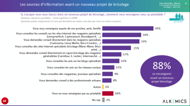 « Lorsque les Français veulent faire un achat, 88% se renseignent ; et le podium des sources d’info est le même pour l’achat en ligne ou en magasin : d’abord le bouche à oreille, puis les sites Internet des magasins spécialisés- type Mr Bricolage, Castorama, etc., et en 3e position viennent les magasins spécialisés ».