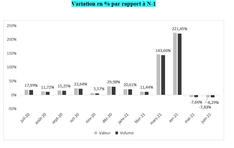Deux mois d'affilée avec des baisses supérieures à -7 % ... il y aurait de quoi inquiéter dans n'importe quel secteur. Surtout sans contraintes exogènes ! Mais au final, on se répète, le marché se compare à 2020. Or en mai et juin le marché oscillait entre +20 % et +30 %. Donc il était inimaginable de faire mieux en 2021. Surtout au moment où les Français économisent pour partir en vacances. L'indice banque de France compare aussi l'évolution du CA entre 2019 et 2021 avec l'évolution du CA entre 2018 et 2020 (assez bizarre vue l'année 2020) et en conclut une progression du marché en 2021 comprise entre + 16 % et +20 %. . Depuis le début de l'année le marché progresserait en 6 mois de 33,42 % en valeur et de 25,49 % en glissement annuel. A surveiller désormais une probable inflation du prix des produits qui pourrait créer un effet repoussoir sur les clients et provoiquer des baisses plus sévères...ou pas !
