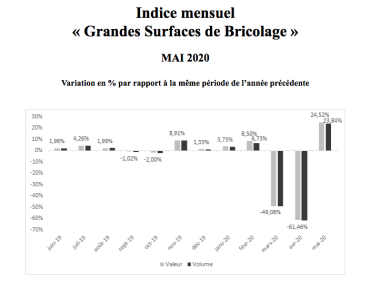 Attention ce n'est pas par rapport à avril 2020 mais bien à mai 2019. Certes, l'an dernier, le marché était à -1 % mais là la correction est énorme et correspond à tout ce qui est vécu actuellement pr les enseignes où les magasins ont deux problèmes à gérer : l'approvisionnement et la fatique. Chez Mr Bricolage on nous confié que certaines semaines on enregistré des + 100 % ! Des adhérents dorment même au magasin ... Un mois de folie avec certains rayons type peinture très souvent vides. En glissement annuel , c'est-à-dire depuis janvier le marché reste négatif mais autour de -6 % en valeur. En revanche comparé à 2019, le baromètre montre un retard encore significatif puisque supérieur à -16,5 % en valeur.