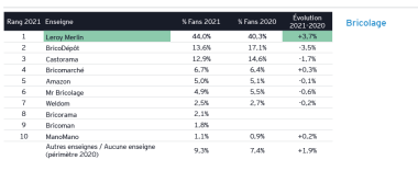 Organisé par la marque média Marketing, sur la base d'une étude menée par le cabinet EY-Parthenon, l 'Enseigne préférée des Français concerne 16 secteurs aussi divers que l'alimentaire, l'optique en passant par l'équipement de la maison, le bricolage et le jardin. Et à ce jeu c'est le bricolage qui gagne représenté par Leroy Merlin qui devance Décathlon, Amazon et 143 autres enseignes... Des enseignes notées par 8 000 consommateurs sur la satisfaction globale et 14 critères. Et à ce jeu, Leroy Merlin finit premier dans la catégorie Bricolage et premier au classement général grâce à de bonnes notes dans les secteurs les plus importants à savoir la Qualité de l'offre, la Confiance dans l'enseigne et le Service après-Vente. Les troupes de Thomas Bouret ont bien failli ravir la première place également dans le secteur jardin mais Gamm Vert tient son rang. Hormis Leroy Merlin, toutes les enseignes du classement bricolage perdent des points sauf Bricomarché et Mano Mano. A noter que le pure player est, comme les autres spécialistes du web, assez mal classé au général. Avec 1,1 % de fans contre 44 % pour Leroy Merlin, Mano Mano se classe 146 ème au général !