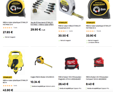 Prenons l’exemple du mètre ruban : l’internaute tombera sur 71 offres en lignes. Quelque soit son tri (pertinence, prix croissant ou décroissant) ce sont les 22 référencés Leroy Merlin qui s’afficheront en premier… puis la cinquantaine suivante est vendue par ‘les marchands de confiance’ Espace-Pro, Univers Mécanique ou Alienor Loisir (liste ci-dessous). Les Dexter maison et Stanley référencés par Leroy se trouvent donc en concurrence avec KS Tools et autres Cogex ou Milwaukee. Pas dit que cela ne provoque pas des tensions en interne car les tris n’ont plus de sens. Mais le démarrage commercial serait excellent ce qui évidemment ravirait un Leroy-Merlin qui s’était penché sur le dossier de reprise de Mano Mano avant de se raviser et d’opter par sa marketplace maison. On rappelle que c’est le marchand de confiance qui facture et livre. Donc, si Leroy-Merlin gagne un million d'euros, au hasard, ... cela ne serait que du volume d'affaires. Reste à connaître sa rémunération .