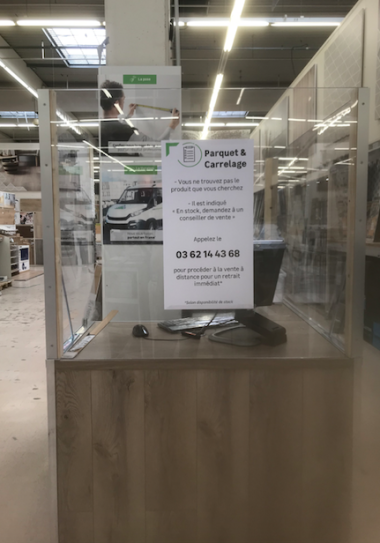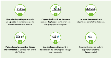 L'eneigne Castorama publie sa méthode pour éviter tout contact avec le client. les produits seront payés avant. l'automobiliste attend que l'employé de Casto ait posé les achats et qu'il soit rentré dans sa guérite pour sortir et les charger.