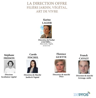 A l’étage Codir, ils sont une douzaine (voir ci-dessus) et c’est Karine Lagier (ex-Gamm vert) qui dirige le service "achat et offre" sauf pour l’animalerie qui est dans le périmètre de Stéphane Le Tellier ( et l’alimentaire qui resterait géré en direct par Guillaume Dumarché) . Dans l’équipe de Karine Lagier arriverait donc Florence Guette aux côtés de deux « cadors » des équipes anciennes de Gamm Vert et Jardiland que sont Carole Fischel et Stéphane Frisson. Ils se partagent le Jardin/Végétal avec le marché pour l’une , l’innovation pour l’autre. On retrouve aussi Franck Cavaly, directeur de marché notamment d’arrosage et autres outils… Comme Guillaume Dumarché, Franck Cavaly a vécu l’expérience Kingfisher auparavant.
