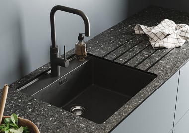 >> Côté stratifié compact HPL, Monochrom, teinté dans la masse, présente l'avantage d'un effet monobloc élégant et Reysitop® celui d'une extrême résistance SURFACE +, supérieure à la norme et aux autres Stratifiés Compact HPL. L'un comme l'autre ne nécessitent aucun traitement des chants et permettent notamment la création d'évier sous plan, de rainurage d'égouttoir...
