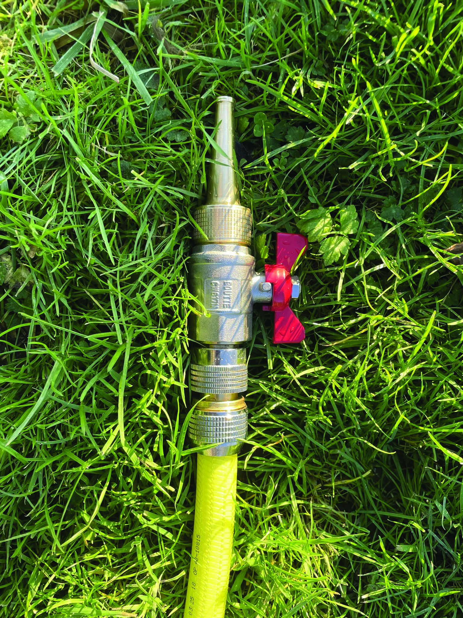 Lance rapide de nettoyage. Tenue en pression 6 bars. Dimensions de l’ensemble (lance, vanne, adaptateur rapide) : 6 x 14,3 x 3,4 cm. Poids : 325 g. 34,90 €.