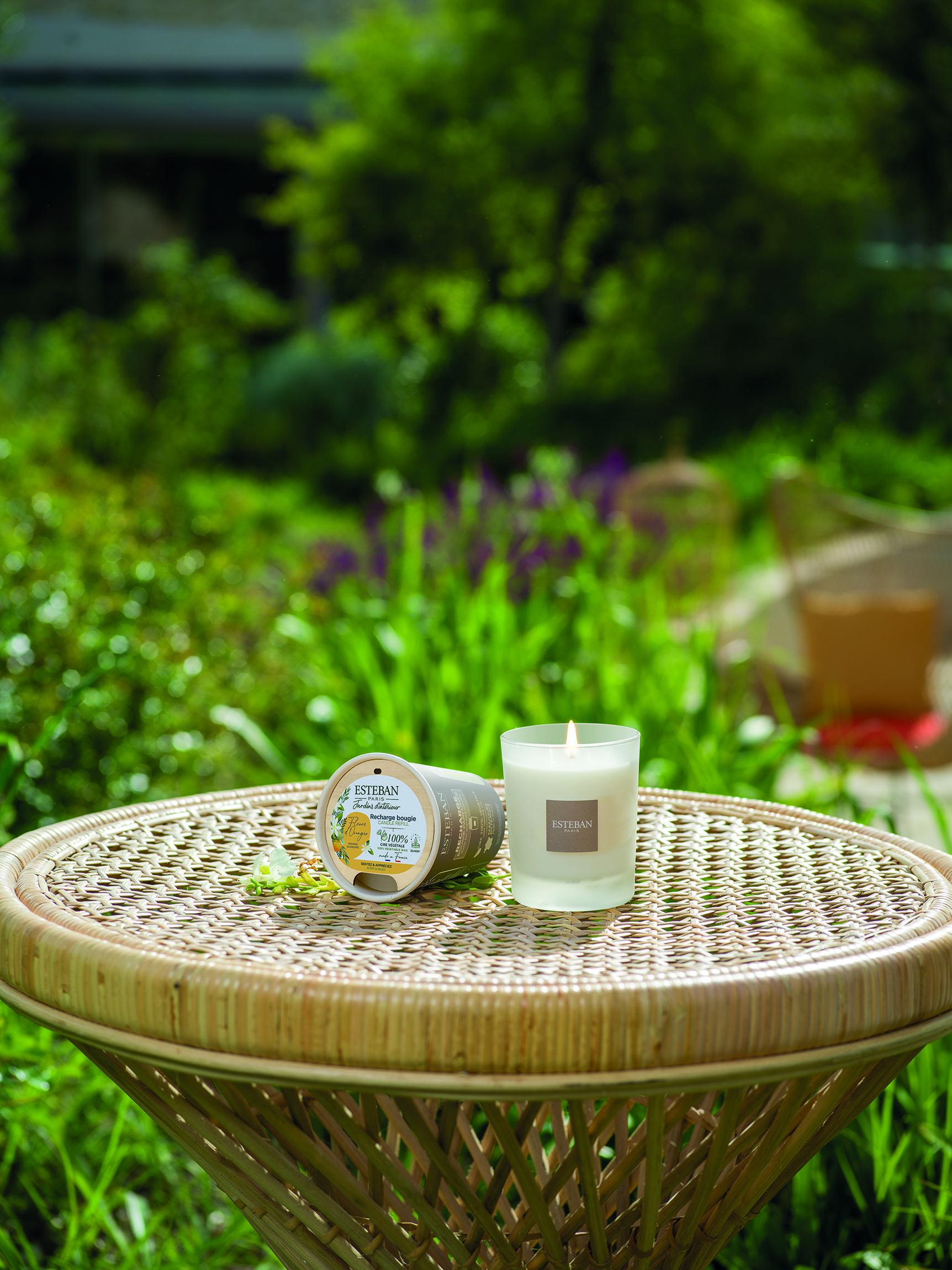 Estéban s’engage en faveur de la préservation de l’environnement en proposant une nouvelle gamme de produits éco-conçus : 82 % du total de ses ingrédients sont issus de l’agriculture biologique. Dans cette collection Jardins d’intérieur, inspirée de la nature, Esteban propose notamment des bougies déclinées en 12 fragrances. Toutes rechargeables, elles représentent une solution économique et écologique, réutilisable à l’infini. Le capot en bois de la recharge, issu de forêts durablement gérées, peut aussi être utilisé pour parfumer placard ou tiroir.