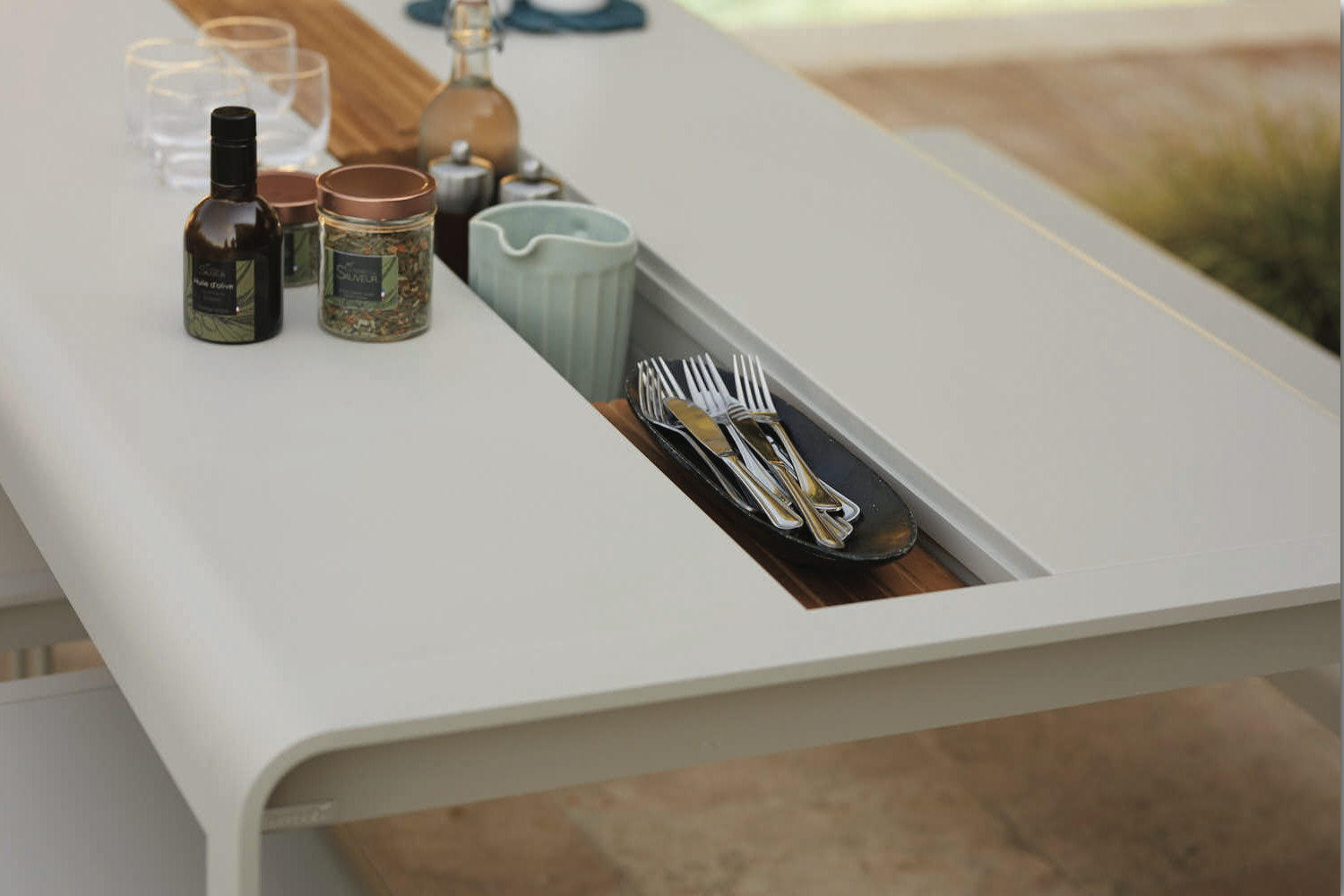 Malin : cette table d'extérieur offre un espace de rangement intégré pour garder toujours à portée de main, bouteilles, couverts, serviettes ou autres épices. Ses tablettes teck bi-face (côté rainuré) peuvent aussi être utilisées comme dessous de plat pour y poser les plats chauds. Une fois le repas pris, il suffit de replacer sur la travée les 4 tablettes en teck, côté lisse, afin de former un joli chemin de table.