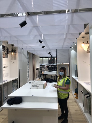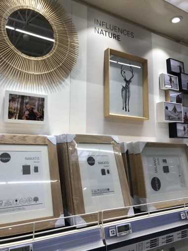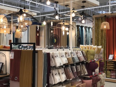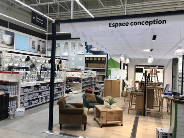 Le magasin commence avec le rayon luminaires, puis les cadres, les voilages, la peintures etc. A droite un atelier conception tenu par Laura, chef de secteur et passionnée qui orchestre son village déco par des tendances transverses. Par exemple, l’écriture Nature, pour parler comme un archi déco, se retrouve dans les rayons luminaires, peintures, papiers peints etc… « L’idée est d’aider l’habitant à rester dans le style choisi explique-telle, de réaliser les bonnes associations même s’il reste libre d’apporter sa personnalité. » Et pour ça, il y a au cœur de ce village, l’atelier conception et coaching pour tester des rapprochements. On pourra ainsi mixer de l’industriel et du design etc Laura nous explique aussi que les clients qui viennent se faire coacher pourront se faire livrer les produits qui ne sont pas ici mais au catalogue ou sur la marketplace.
