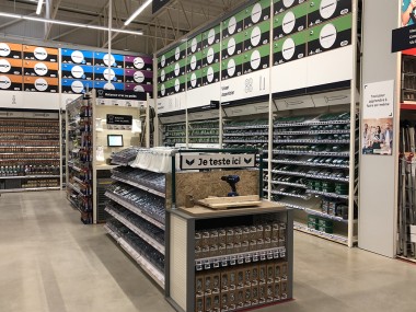 La deuxième partie du magasin… on passe de la « belle à la bête » sourit Aurélien Chantrait. Traduction : nous voilà dans un vrai magasin de brico et ses rayons techniques. Mais cette bête est apprivoisée car là aussi on ne veut pas refroidir le client. Les entrées d’univers sont avec meubles bas, ainsi on a une vue générale du rayon qui est en U. Les têtes de gondoles sont animées par des constructions amusantes. Idem pour la quincaillerie avec le choix de bacs transparents, là aussi des rayons bas. Ces rayons à forte marge ne sont plus des « tue-l’amour ».