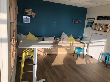 A l’extérieur la cour matériaux est assez classique hormis ce parking qui en surplombe une partie. A noter un compacteur en arrière cour pour une gestion plus écolo des transports des déchets. La nouveauté se situe plutôt côté personnel avec un escalier truffé de références historiques au passé de l’enseigne. En haut surprise, c’est aussi beau que dans la partie expo du magasin. C’est sûr que le salarié qui arrive ici peut ressentir comme une certaine considération. Il y a une cuisine façon coloc d’étudiants, des zones de détente, de « zénitude », des bureaux d’entretien etc. Une architecte d’intérieur a donné à chaque pièce une touche particulière et locale. Si on aperçoit la mer au loin il n’y a en revanche pas de vue depuis cette passerelle sur l’intérieur du magasin. « je préfère qu’on descende voir ce qui s’y passe plutôt que de rester en haut à regarder si on a besoin », explique un Aurélien Chantrait qui n’attend plus qu’une chose : vérifier que les réglages de ce magasin moyen format trouve … son public