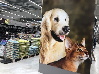 L’enseigne Nos Animaux occupe une vaste zone du magasin avec force petfood, oisellerie, rongeurs vivants. La signalétique de l’enseigne est reprise mais agrémentée de photos