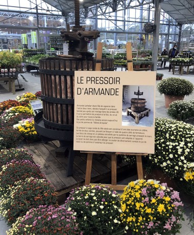 Les rayons outillage de jardin et la zone barbecue dirigent vers une pépinière , marché aux fleurs qui est présentée mi-en patio extérieur mi-en intérieur avec un Moaï, géant de l’île de Pâques trônant au milieu des plantes. Un peu plus loin le Pressoir d’Armande rappelle l’environnement viticole de Mazères.