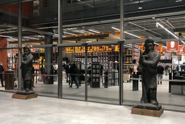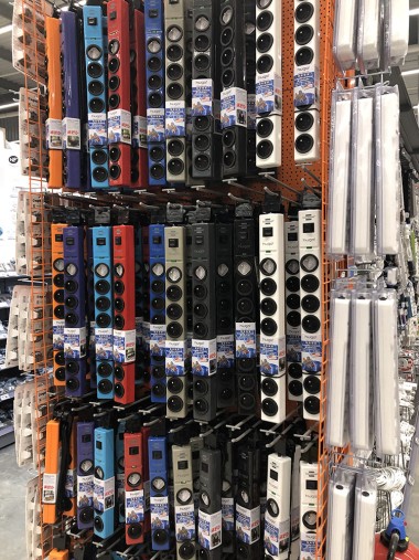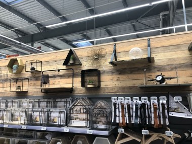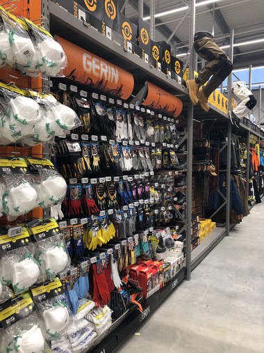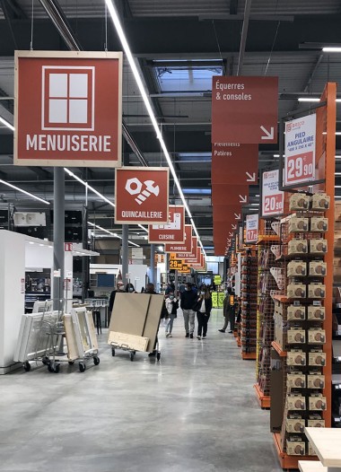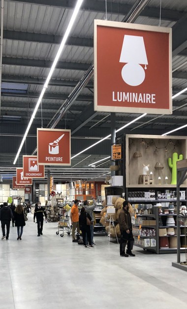 La zone bricolage est la parfaite traduction du slogan « Inspirer et réaliser ». En entrant dans le magasin par l’allée centrale tout ce qui est à votre droite inspire et les rayons de gauche permettent de réaliser. Ainsi, en avançant, nous avons sur main droite les luminaires mis en scène, tout comme l’encadrement et la déco tandis qu’à gauche les rayons sont dédiés à la peinture et à la plomberie. Virage à gauche de 90 ° et là sur 50 m, à droite s’exposent les revêtements de sols, les salles de bains, cuisine, escaliers, portes… A gauche tout ce qu’il faut pour installer tout cela avec une zone quincaillerie, électricité. A noter d’ailleurs que la zone électrique est géante !